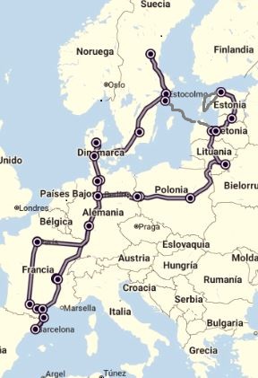 El 29 de abril 2025, inicié mi viaje primaveral de Interrail hacia el norte de Europa con el objetivo de llegar a las repúblicas bálticas, tomar contacto con sus gentes y conocer el territorio, pero con mis paradas por el camino para disfrutar las estancias con anfitriones y amigos Servas. (foto 1: mapa recorrido)